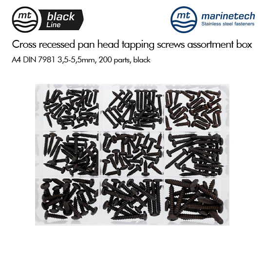 BlackLine DIN 7981 Cross Recessed Pan Head Tapping Screws Assortment Box 3,5-5,5mm 200 parts, black