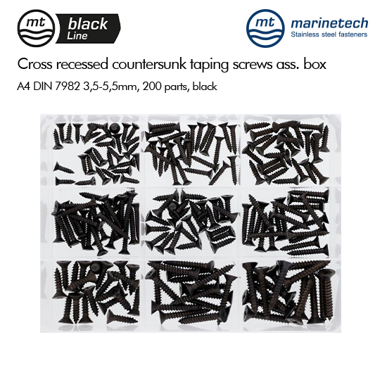 BlackLine DIN 7982 Cross Recessed Countersunk Taping Screws Assortment Box 3,5-5,5mm, 200 parts, black