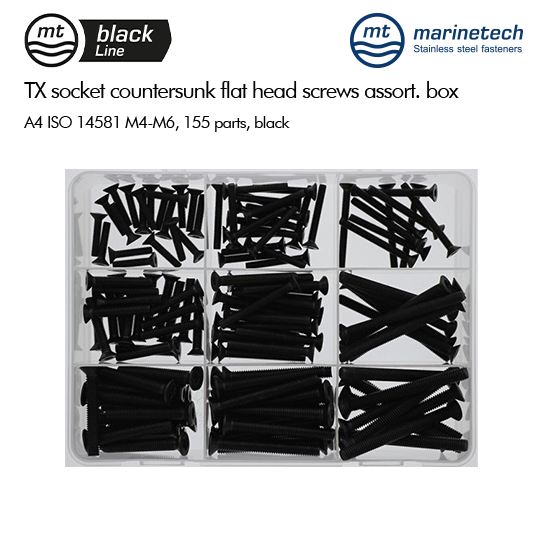 BlackLine ISO 14581 TX Socket Countersunk Flat Head Screws Assortment Box M4-M6, 155 parts, black